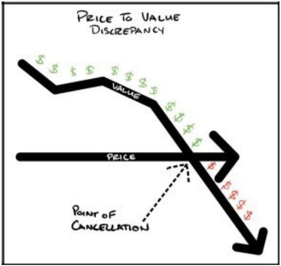 La siguiente gráfica es muy ilustrativa: llamamos Punto de Cancelación al punto a partir del cual la percepción de valor es muy baja en relación con el precio a pagar, y por tanto cuesta mucho más conseguir ventas.